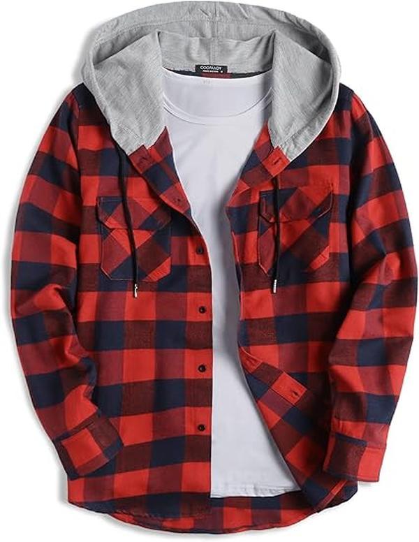 Men's Red & Navy Plaid Hoodie Flannel Shirt Jacket Long Sleeve Casual Fashion Button Shirts Menswear Coats Tops with Drawstring & Elastic Closure