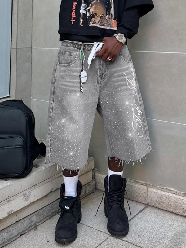 Vintage Distressed Rhinestone Embroidered Casual Jeans, Seven-Quarter Jeans, Letter Embroidery, American Street Style, All Seasons
