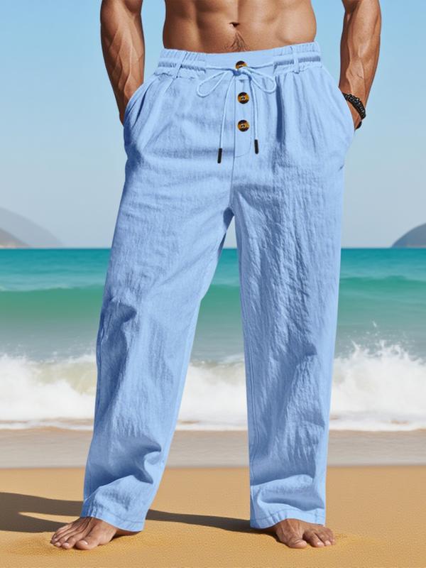 Men's solid - color linen straight - leg pants, drawstring - waist casual long pants with pocket design, loose - fitting wide - leg pants suitable for all seasons, light - washed loose - cut trousers for daily wear.