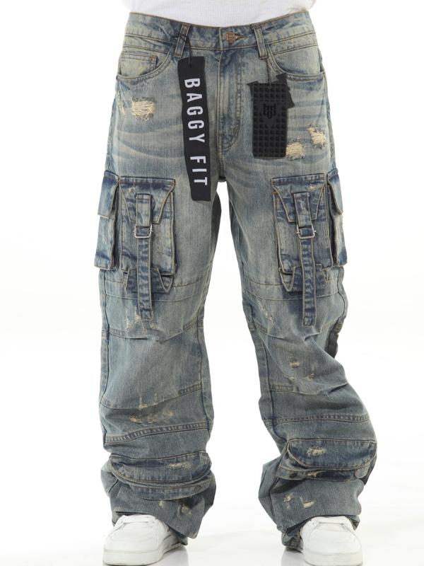 Rise Denim Stacked Flare Straight Fit Men's Jeans with Distressed Look and Cargo Pockets for Urban Style