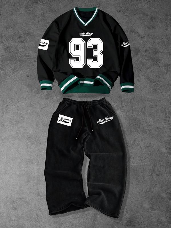 Street Casual Set Unisex Stacked Collar Sweatshirt Long Sleeve Print Pants Two-Piece Set, Colorblock, American Retro School Style