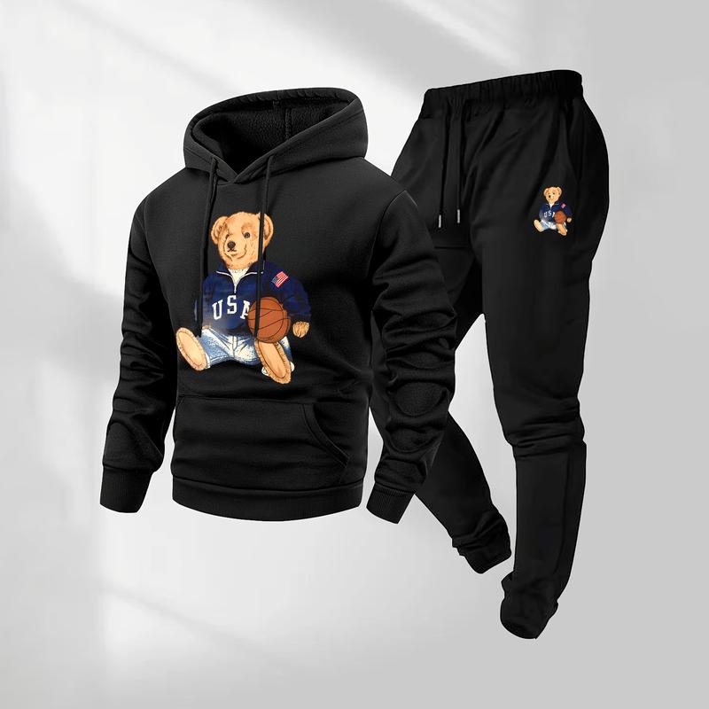 Men's Basketball Cartoon Bear Patterned Hoodie And Drawstring Track Pants Set, Men's Casual Athletic Long-Sleeved Hooded Jacket And Pants, Suitable For Fall And Winter, Street Style Hoodie Set, Indoor And Outdoor Sportswear,