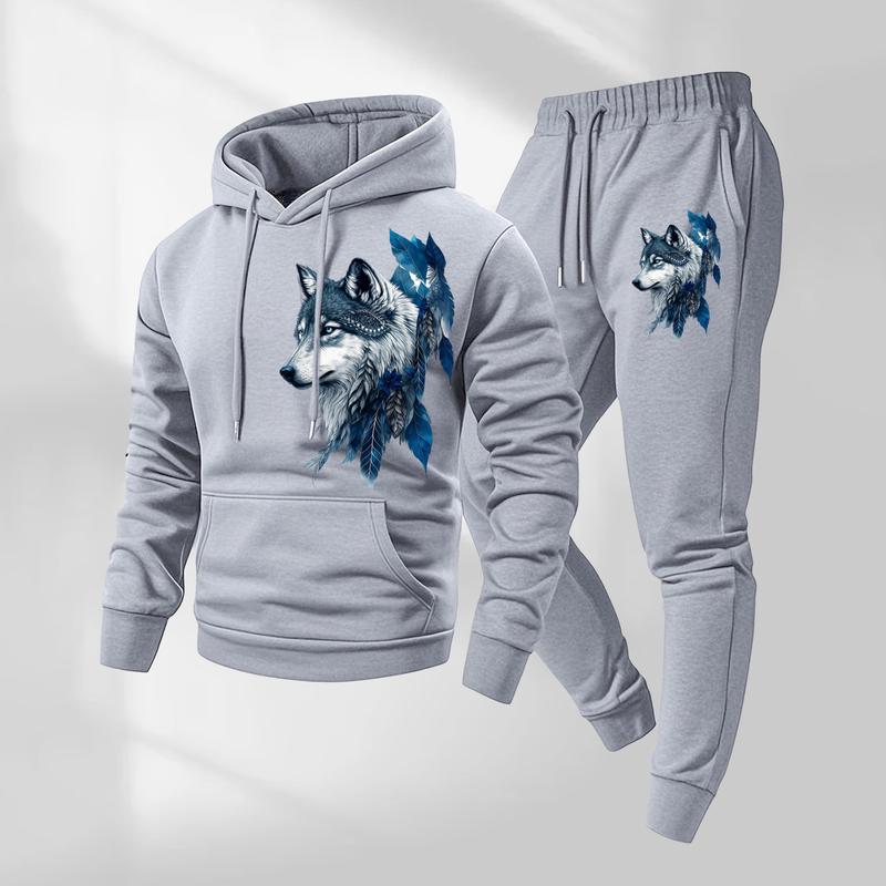 Men's wolf print hoodie and drawstring track pants set, men's casual sportswear, long-sleeved hooded jacket and trousers, suitable for autumn and winter, men's everyday wear, indoor and outdoor sportswear, tracksuit, casual sportswear.