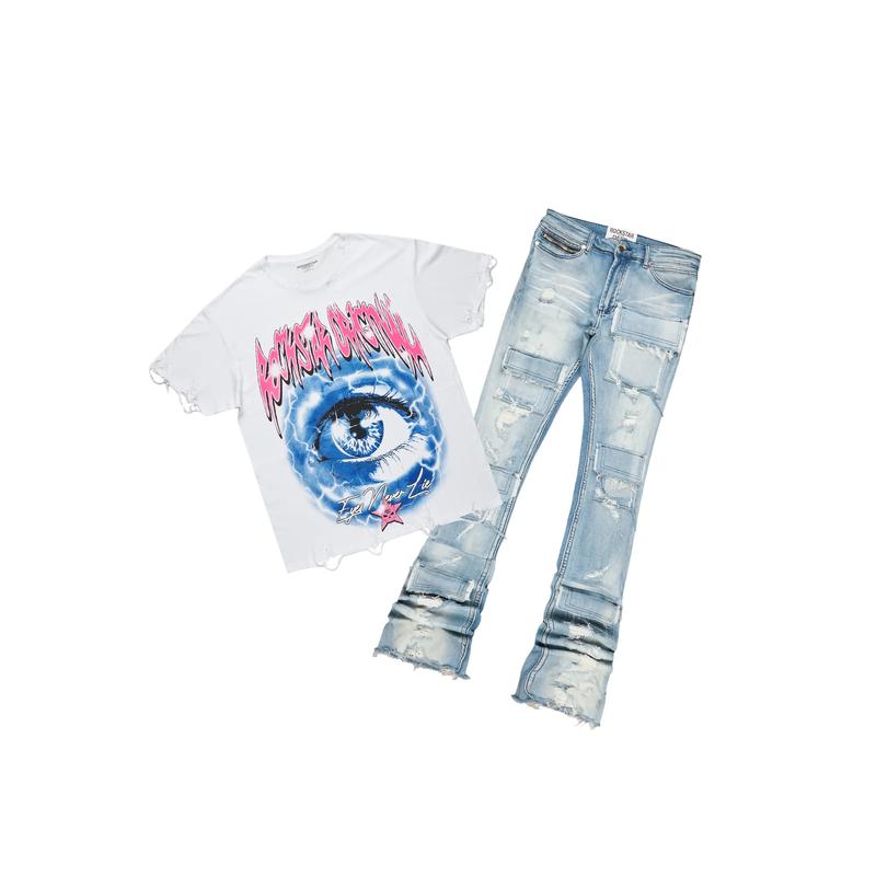 Pello White/Blue Oversized T-Shirt/Super Stacked Flare Jean Bundle