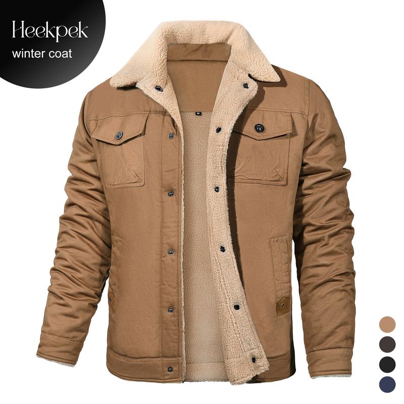 Men's Lined Winter Trucker Jacket Warm Multi-Pocket Casual Coat with Collar Cotton Fleece Long Sleeve Khaki Beige Stylish Menswear Top Suitable for Fall Outdoor Activities Daily Wear