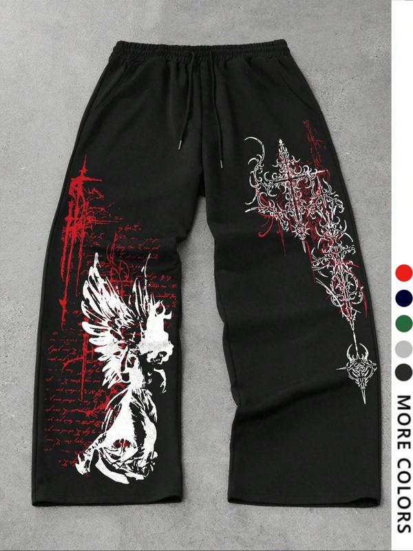 Men's Casual Sporty Long Pants, Angel & Cross Pattern Print, Drawstring Wide Leg Loose Fit, Casual Comfy Sweatpants, All Season Men's Fashion Bottoms