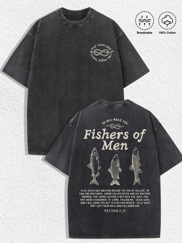 Christian Fishers Of Men Graphic Tee Dark Washed Cotton Shirt With Text Three Fish Illustrations Knot Detail Full Biblical Verse From Matthew 4:19 Ret y2k Vintage Streetwear Menswear Festive Tshirt