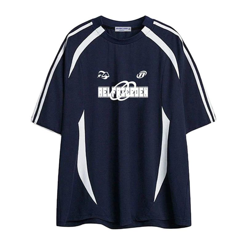 Unisex Contrast Color Stripe Racing Tee Navy Blue Sporty Design 100% Polyester Summer Sports Sweatshirt