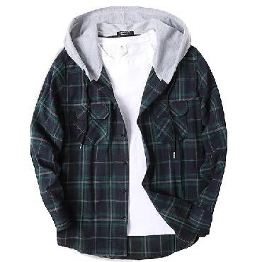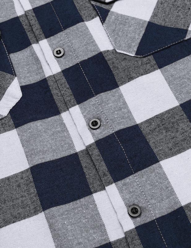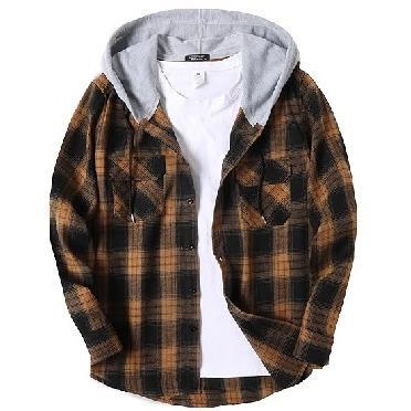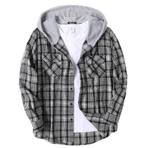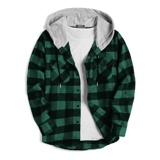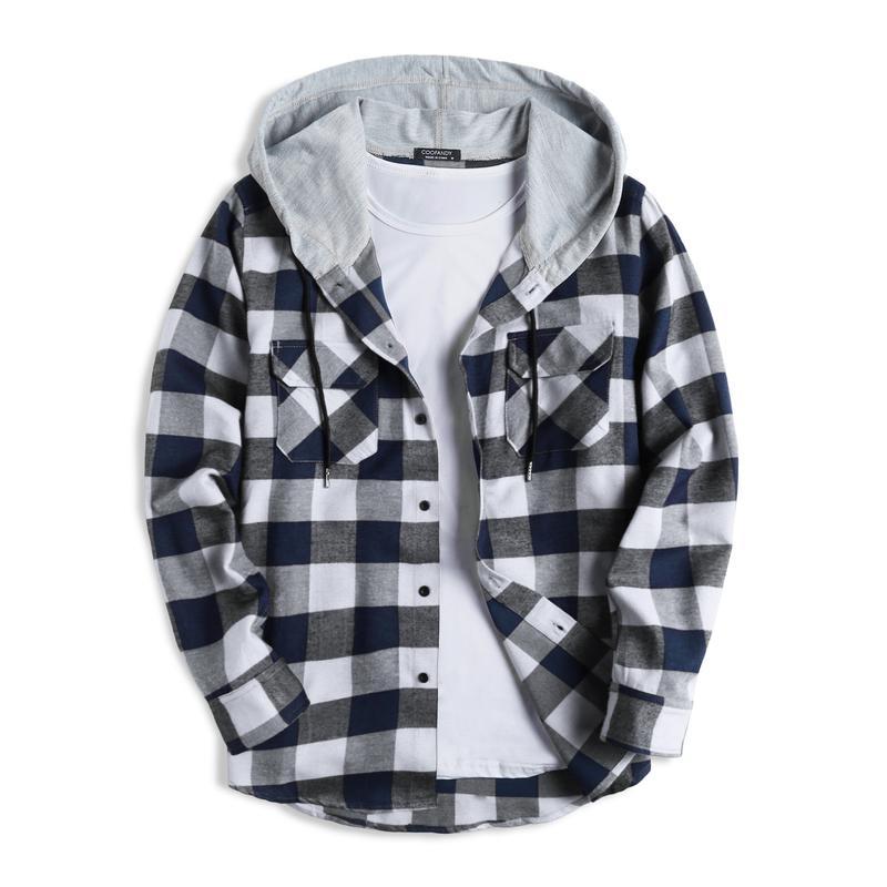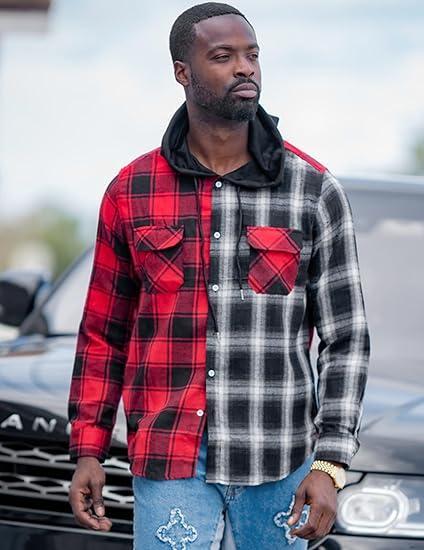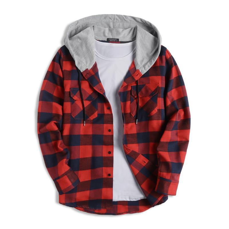 Men's Red & Navy Plaid Hoodie Flannel Shirt Jacket Long Sleeve Casual Fashion Button Shirts Menswear Coats Tops with Drawstring & Elastic Closure
