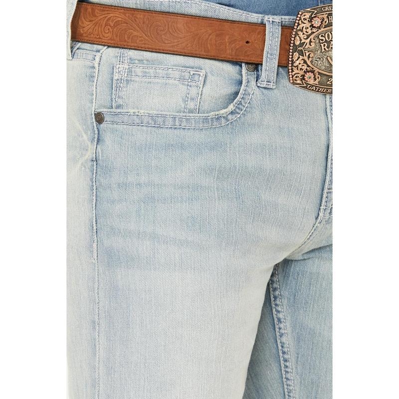 5 pocket construction. Zip-fly with button closure. Slim fit. Bootcut leg.. Finished hems. Light wash. Whiskering and hand sanding details. Signature embroidery on back pockets. Imported. The model is 6'1".