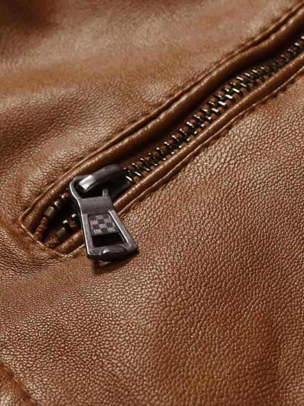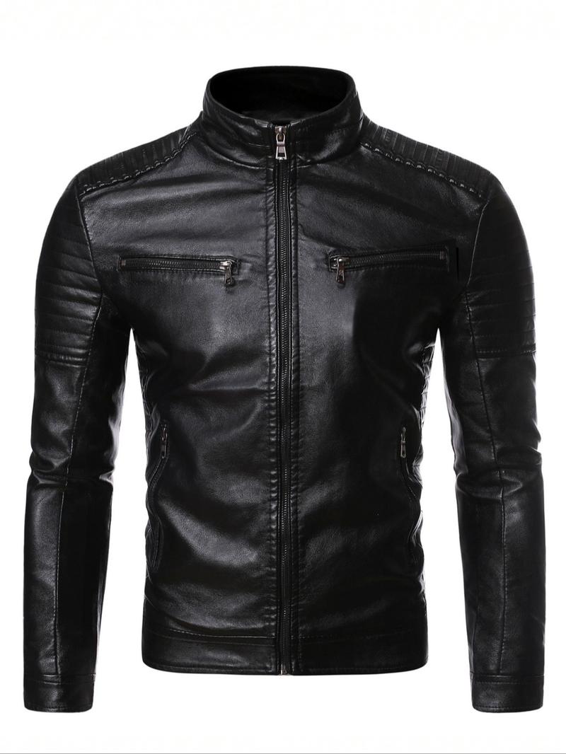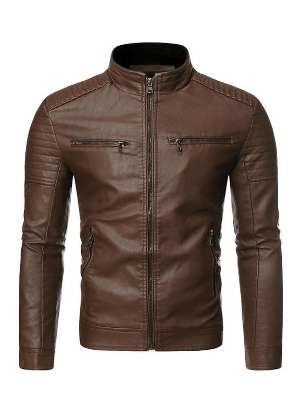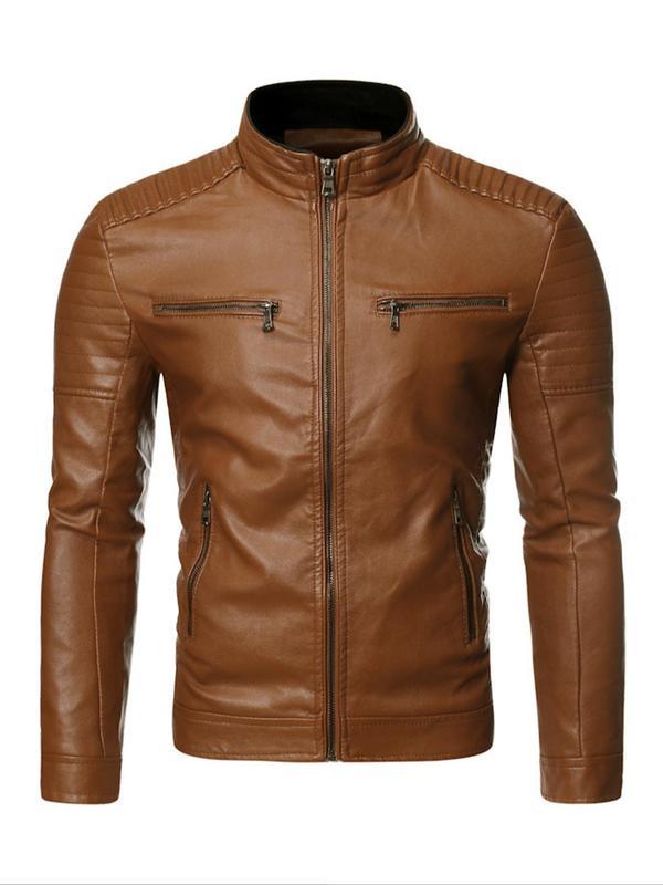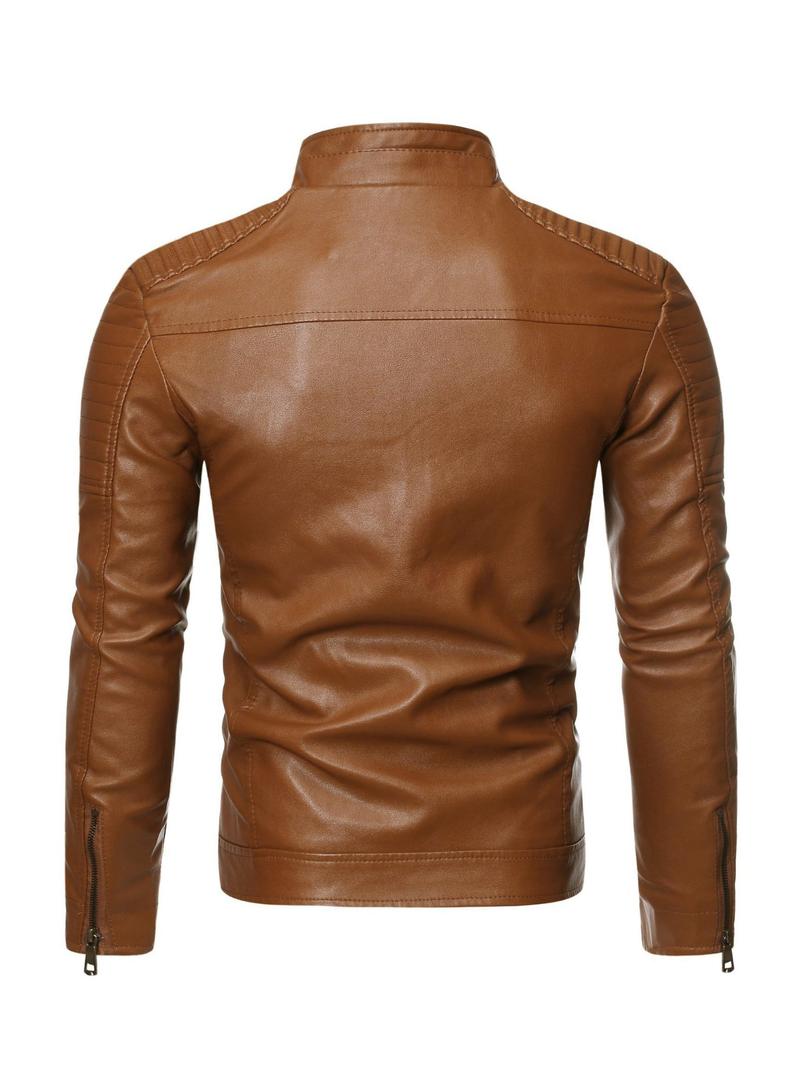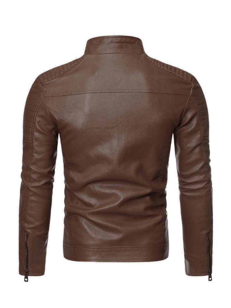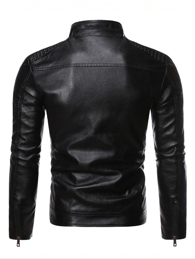Men's Solid Zip Up Mock Neck Faux Leather Jacket Coats, Slim Casual Long Sleeve Outerwear for Fall & Winter, Men's Clothes for Daily Wear