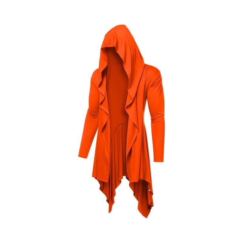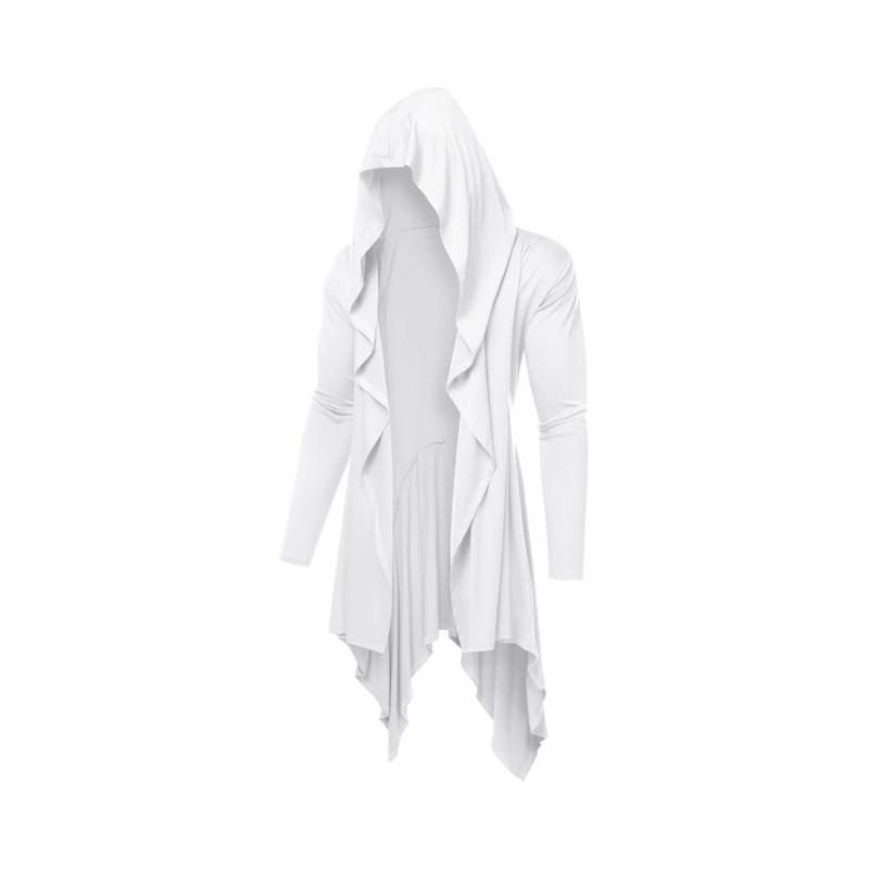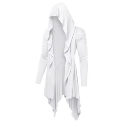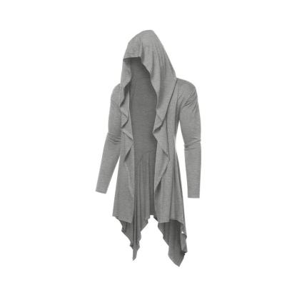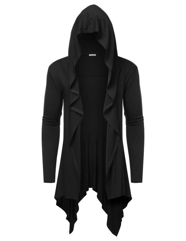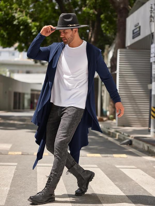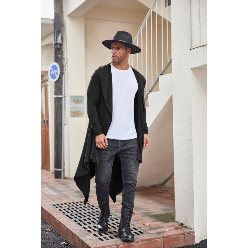 Fall Outfits Men's Black Long Hooded Cardigan Ruffle Shawl Collar Open Front Lightweight Drape Cape with Side Pockets Casual Elastic Workwear 3/4 Length