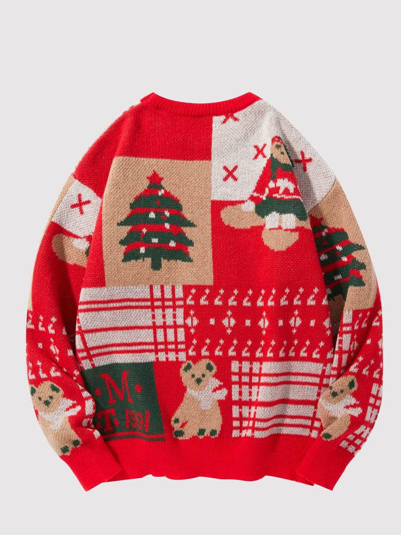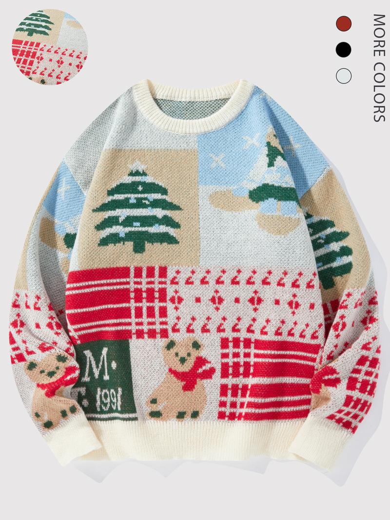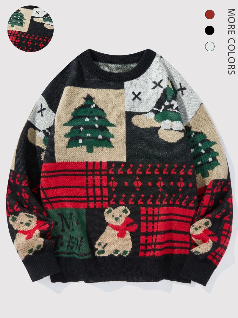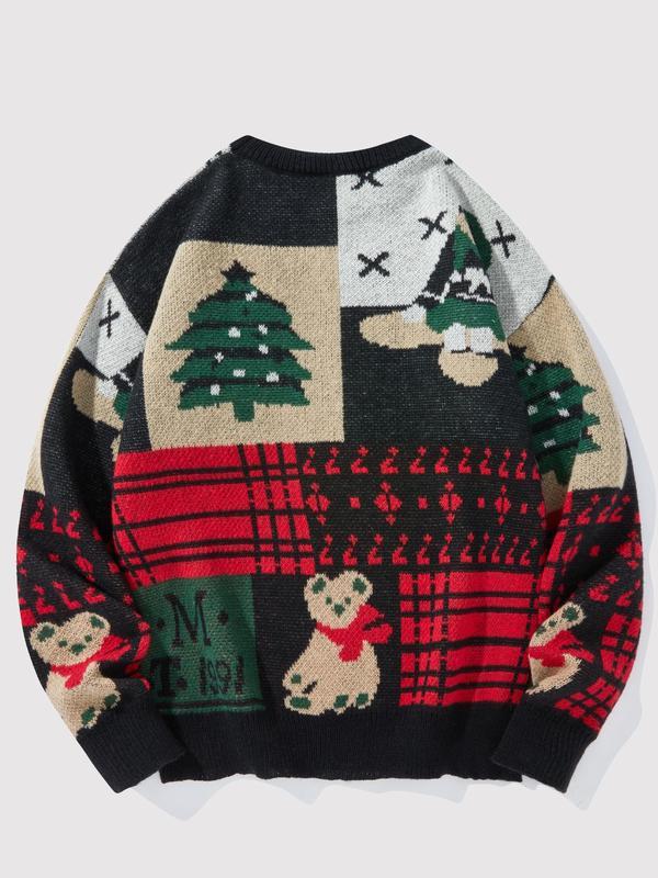 Men's Christmas Tree & Bear Print Drop Shoulder Sweater Pullover, Casual Regular Fit Long Sleeve Round Neck Jumper for Fall & Winter, Fashion Men's Knitwear for Daily Wear
