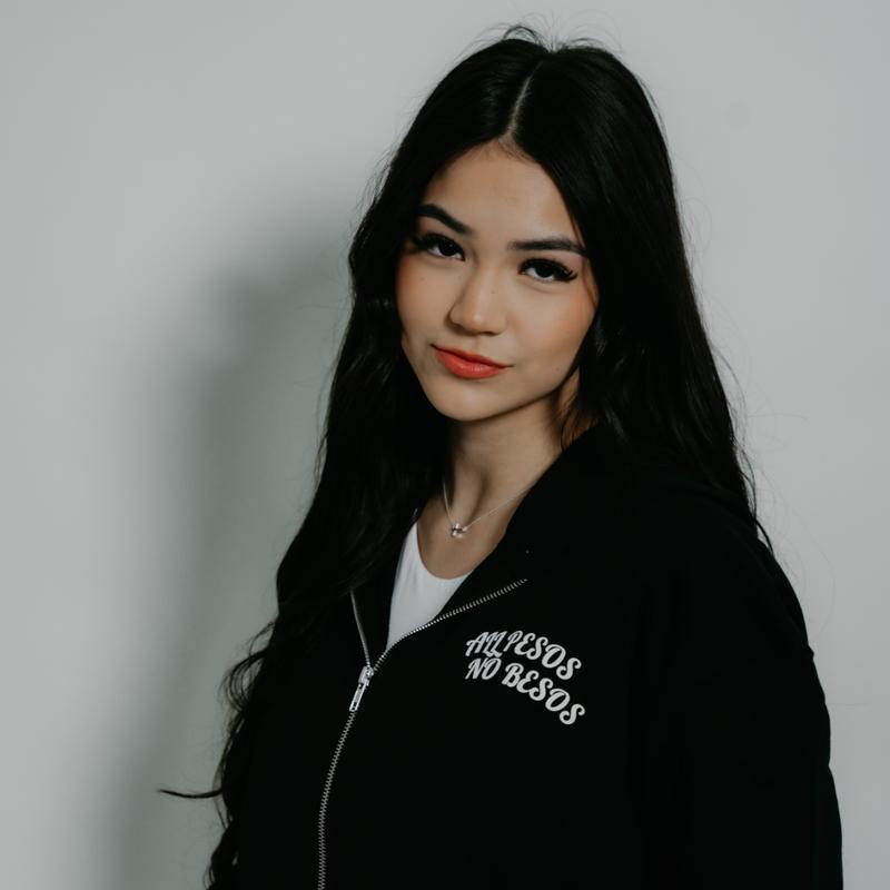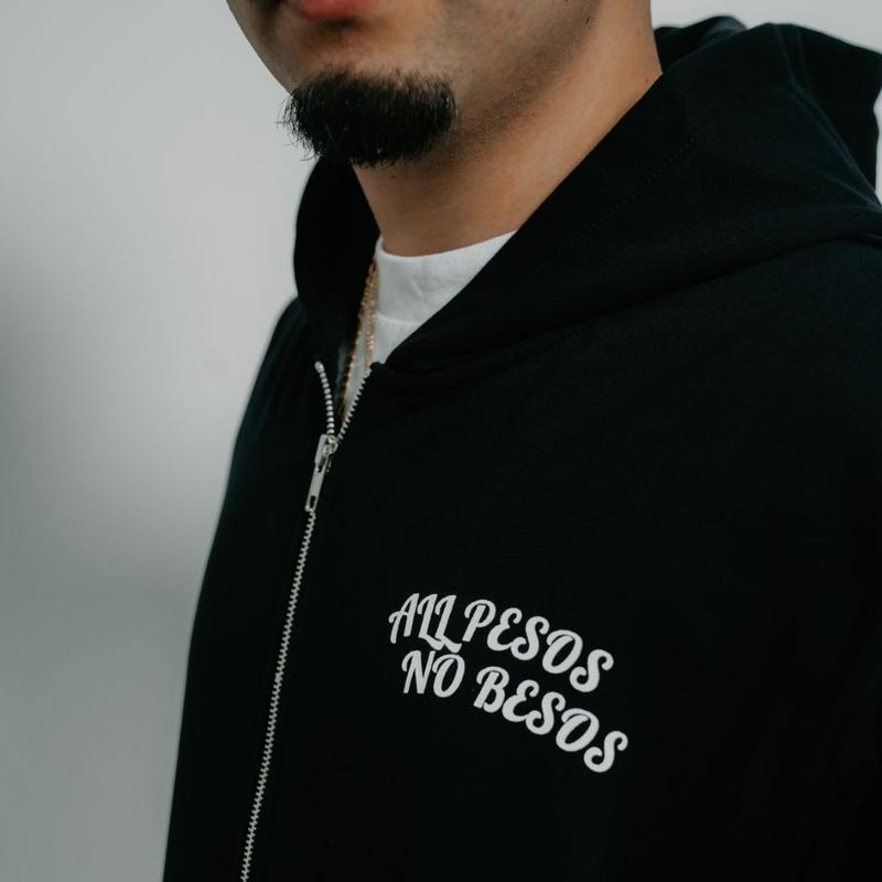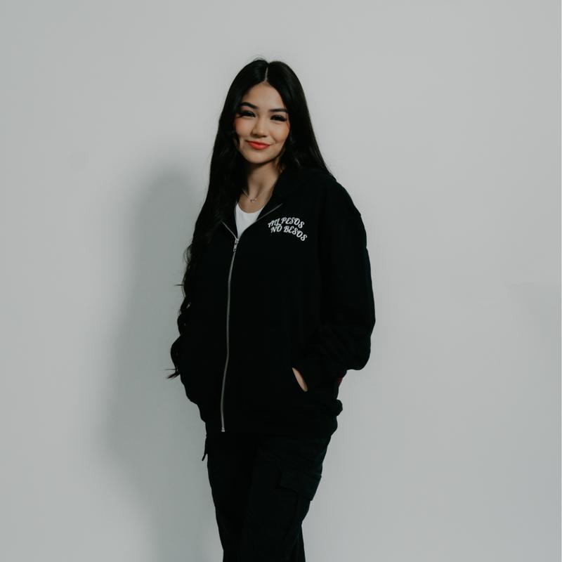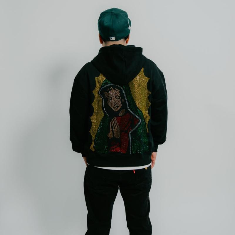 The hoodie features a rhinestone print of Virgencita. It has a hooded design and a front pocket. The design is perfect for those who appreciate a stylish and comfortable hoodie.