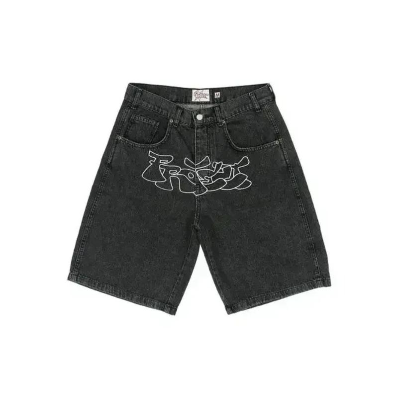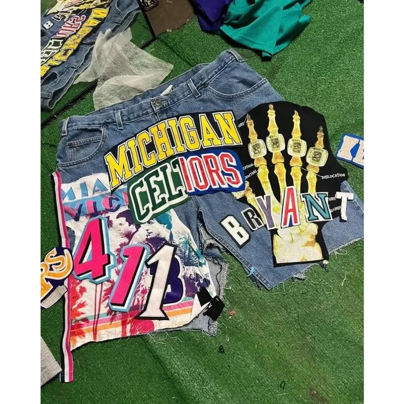 Streetwear Retro Patchwork Denim Short Y2K Jeans Men Women Hip Hop Cartoon Graphics Retro Blue Loose Denim Fitness Casual Shorts