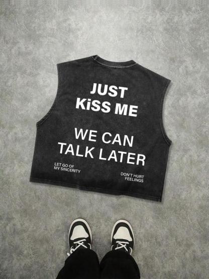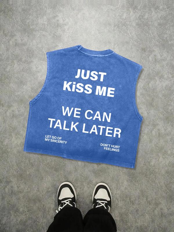 Men's Just Kiss Me Letter Print Tank Top, Loose Casual Street Sleeveless Top for Summer, Men's Clothes for Daily Wear, Streetwear