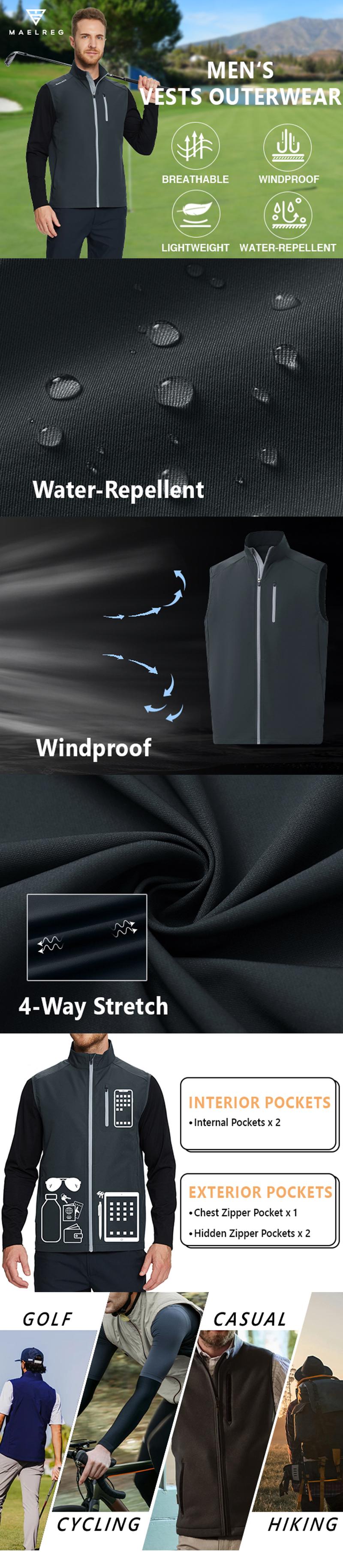 PERFORMANCE MATERIAL: Crafted from a blend of polyester and spandex, this mens vests outerwear offers water-repellent, windproof, quick dry, lightweight, 4-way stretch properties.It significantly enhances overall practicability and comfort on or off your golf course.