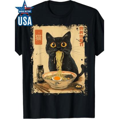 Stylish Vintage Kawaii Cat Ramen Graphic T-Shirt for Men 100 Cotton Comfortable Crew Neck Short Sleeve Casual Top with Heat Transfer Print Regular Fit All Season Wear Made in USA