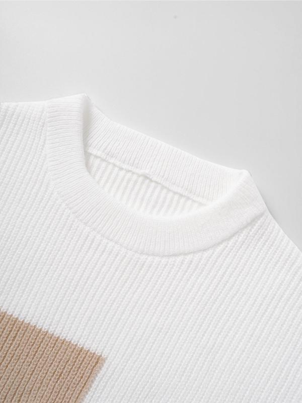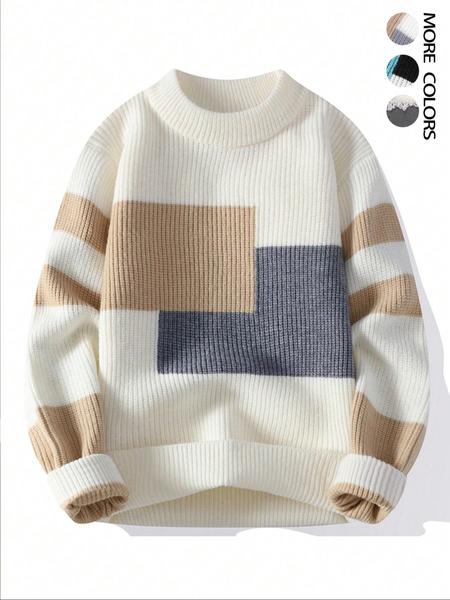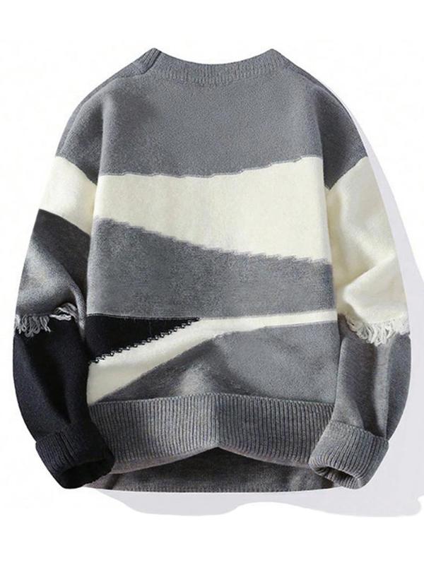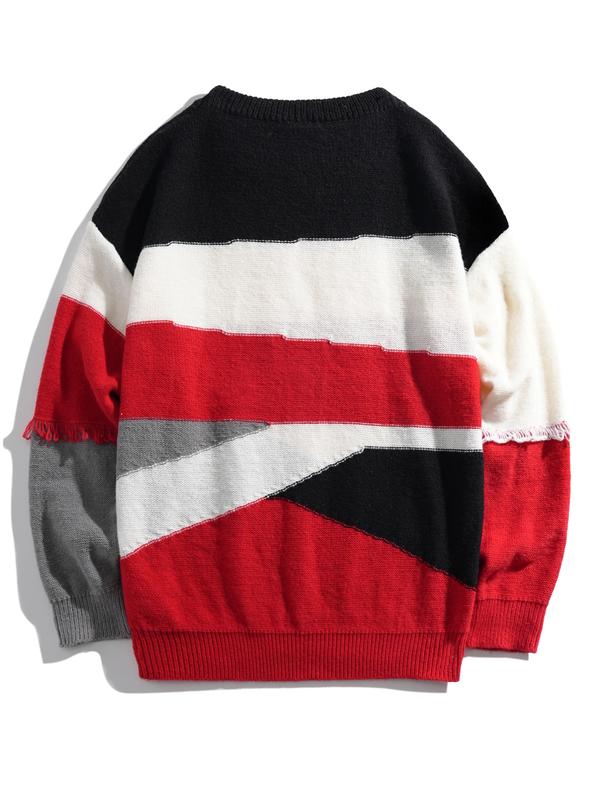 Men's Geometric Pattern Pullover Sweater, Stylish Casual Crew neck Drop Shoulder Long Sleeve Knitted Top, Color Block Striped Sleeve Design Fashion Fall Winter Inside Top Soft Warm Daily Life, Trendy Men's Outdoor Going Out Fashion Knitwear