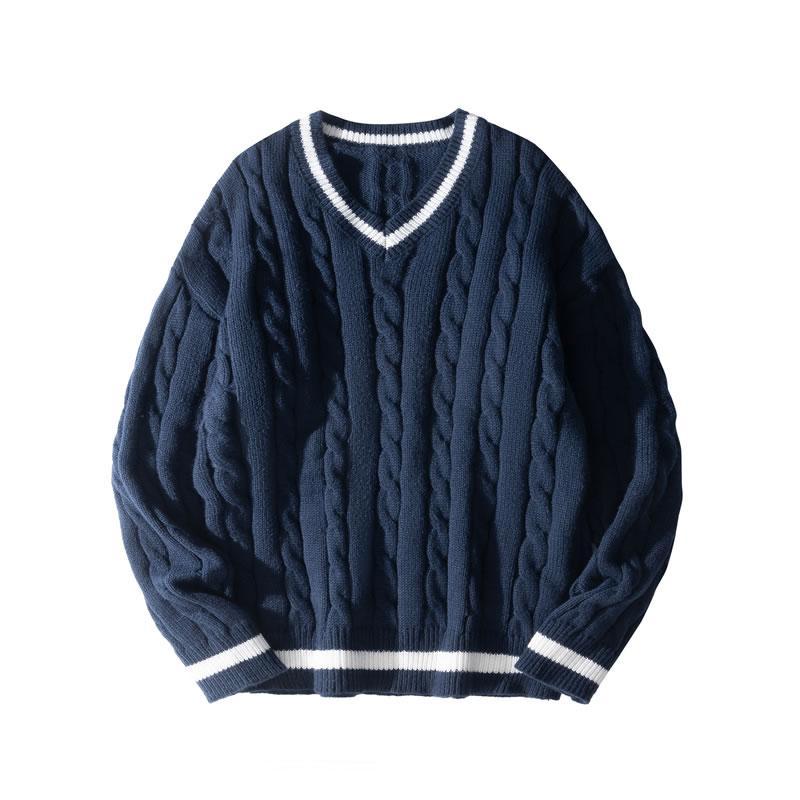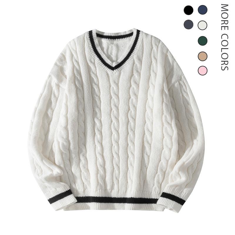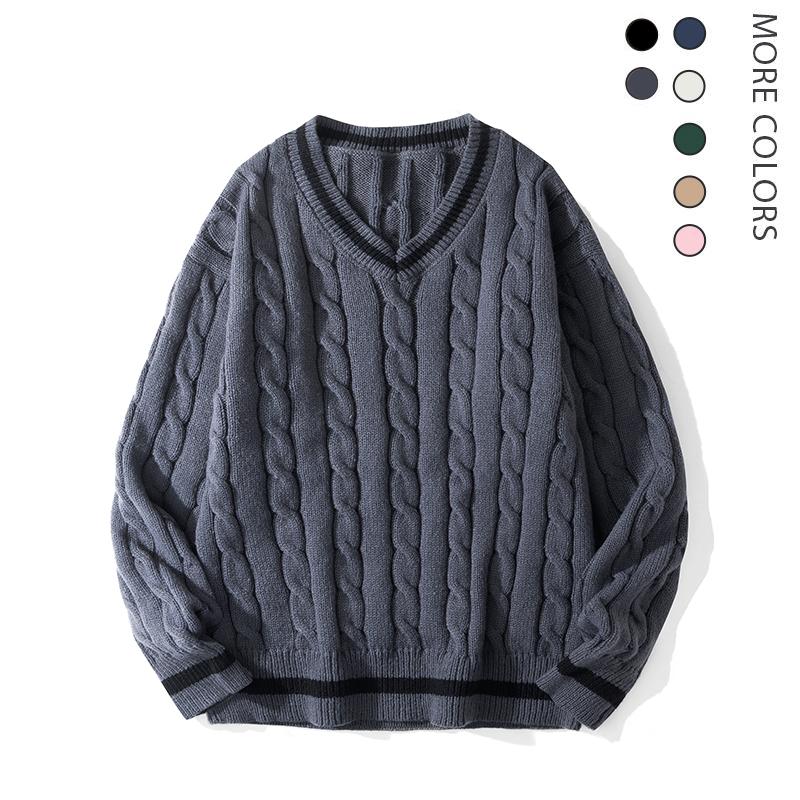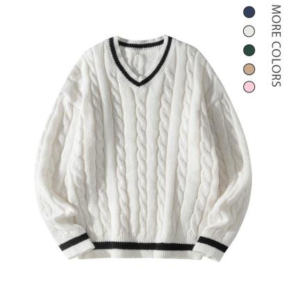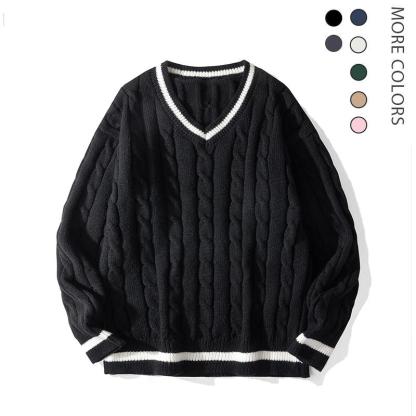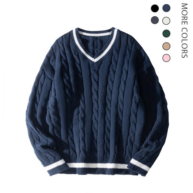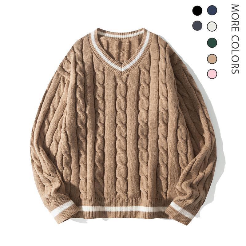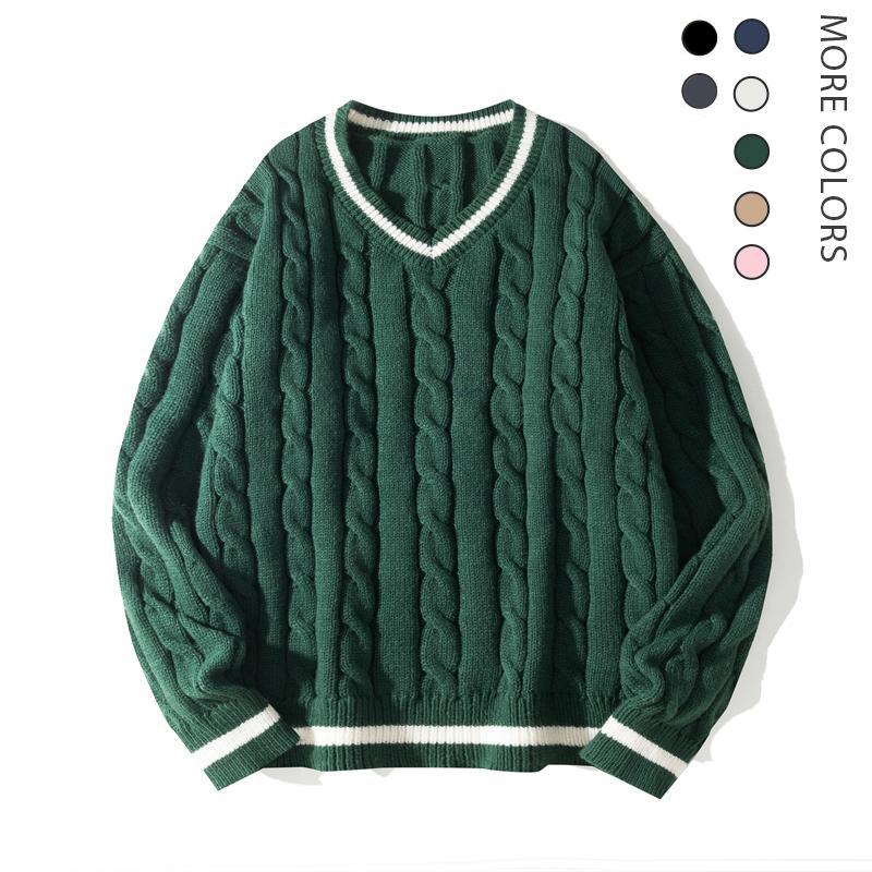 Men's thick and warm knitted sweater in autumn and winter style, casual and fashionable, loose and easy to match with polyester material, V neck striped top, street wear, oversized knitted men's shirt, fashionable fabric, college style, unisex