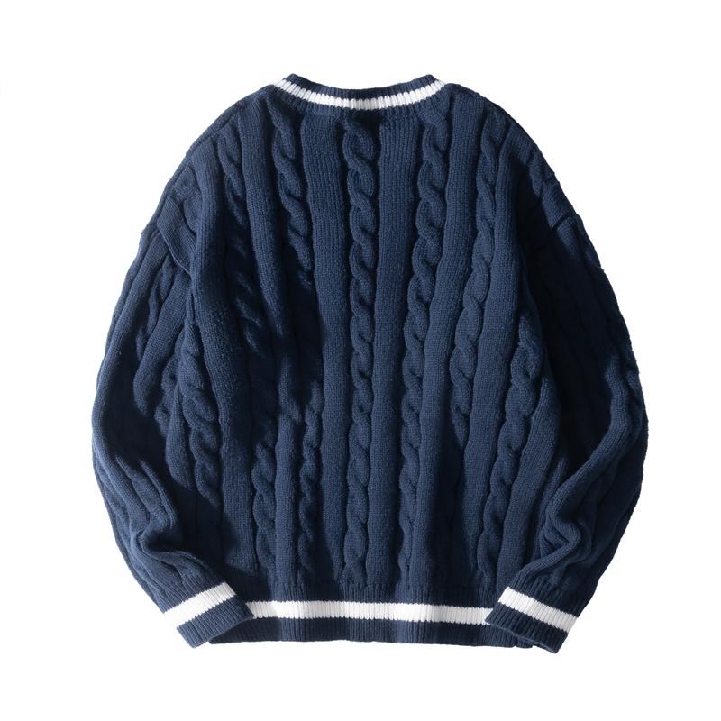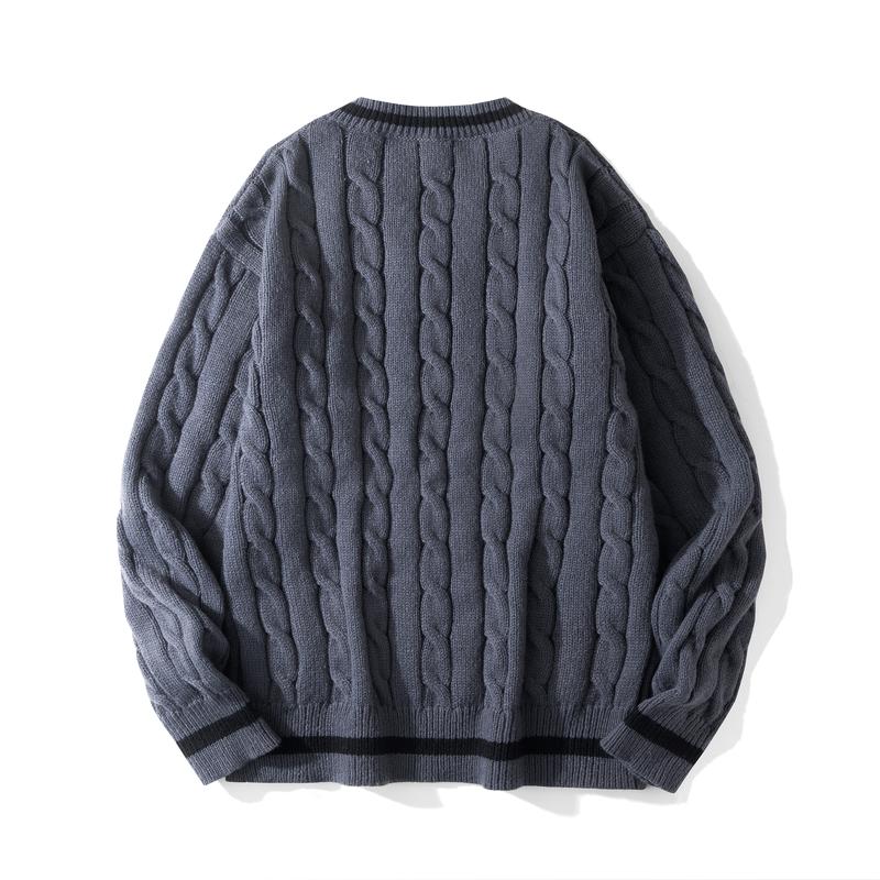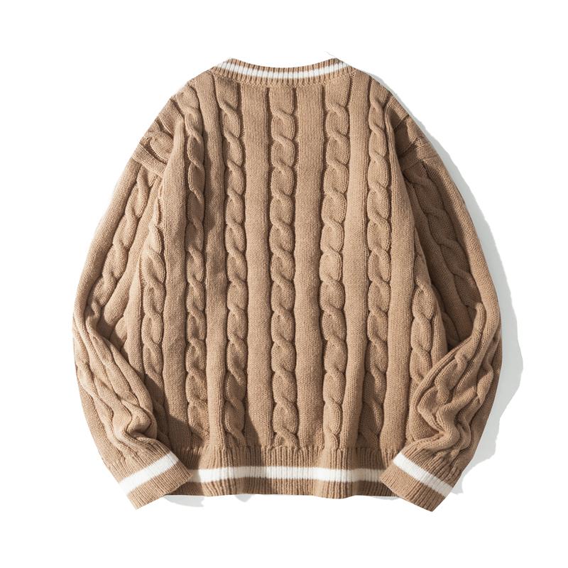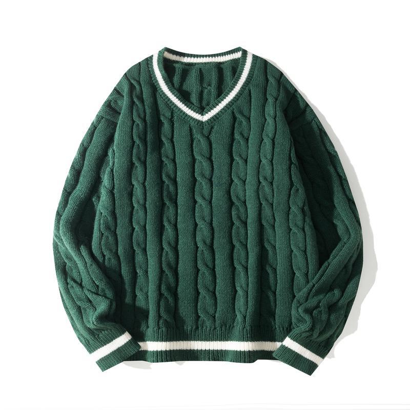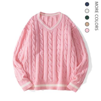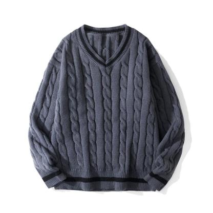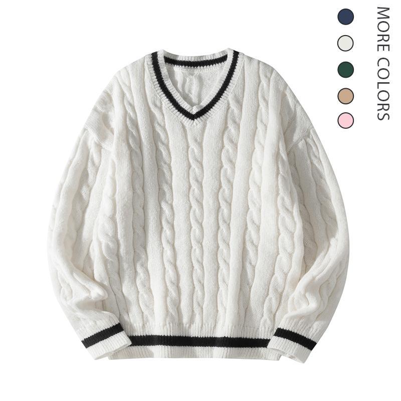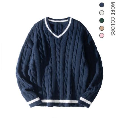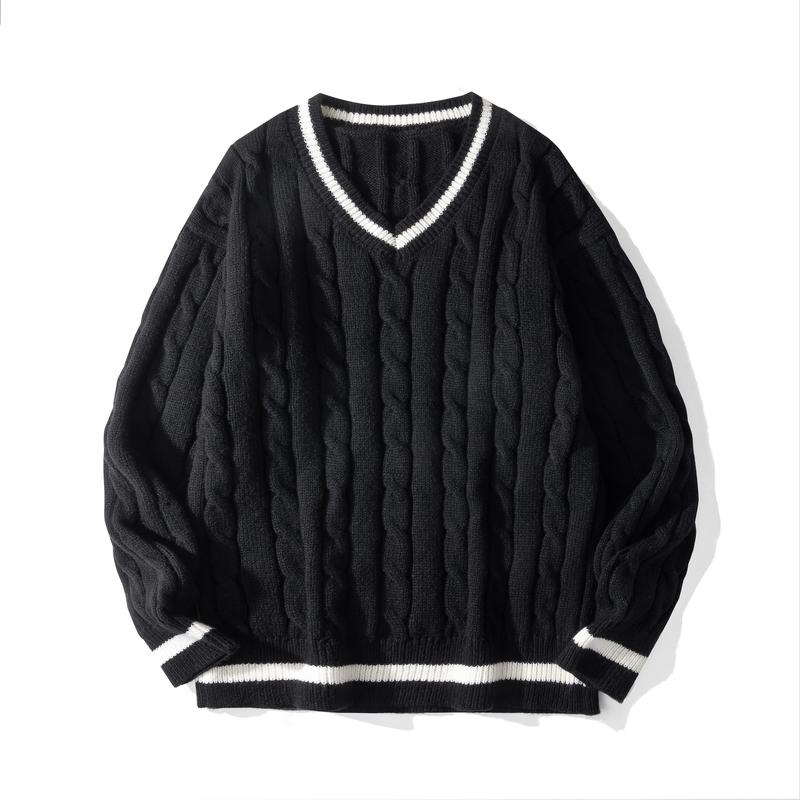 Men's thick and warm knitted sweater in autumn and winter style, casual and fashionable, loose and easy to match with polyester material, V neck striped top, street wear, oversized knitted men's shirt, fashionable fabric, college style, unisex
