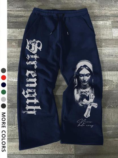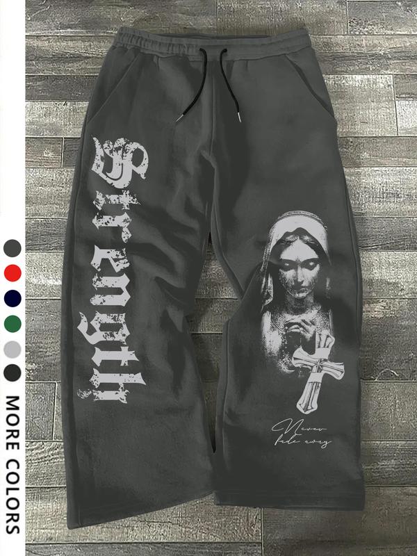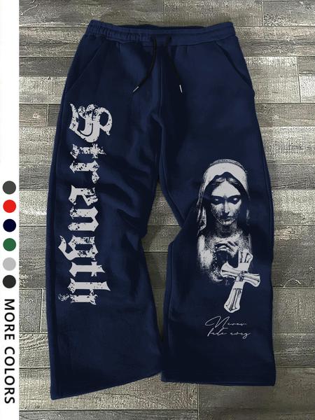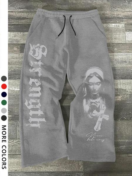 Men's Casual Loose-Fit Drawstring Pants, All-Season Wide-Leg Sweatpants with Nun Print, Comfortable Long Trousers for Everyday Wear