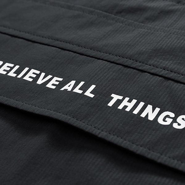 This trench coat features both style and practicality. The half zipper and drawstring hood design combine fashion and practicality. The slogan print makes it a unique addition to your wardrobe. Suitable for those who seek both style and practicality.