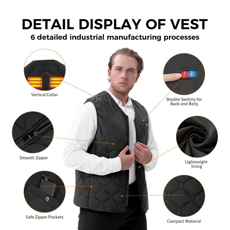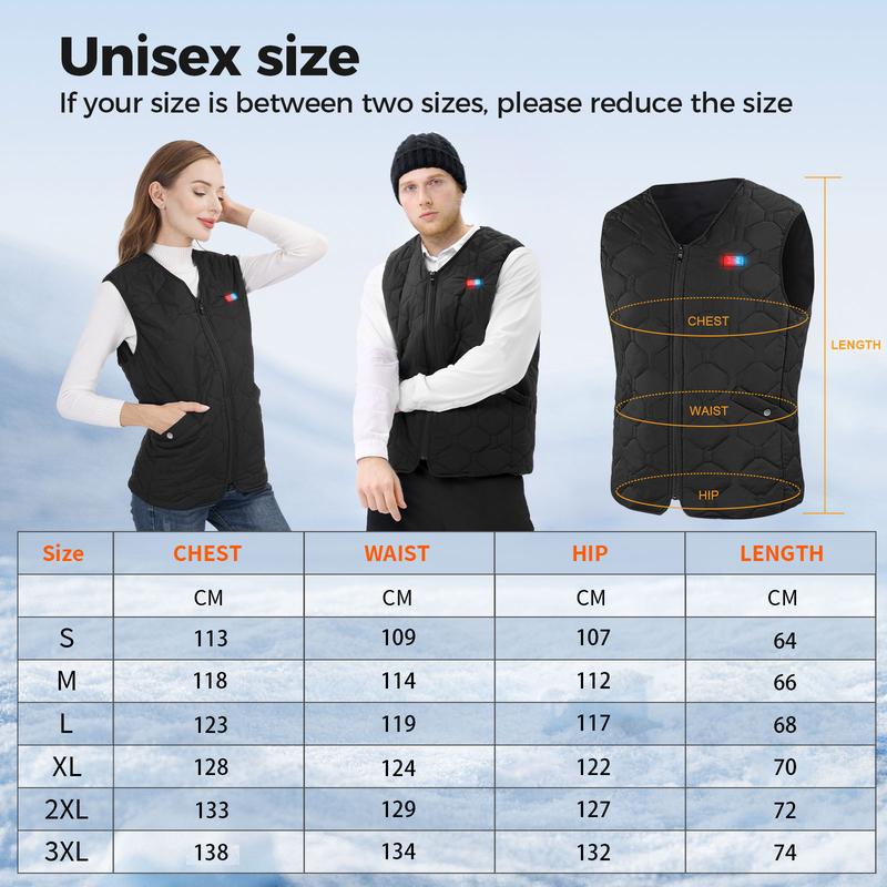 Crafted from waterproof and windproof fabric, this sleeveless vest offers comfort and ease of care.The cotton filling ensures warmth, while the 15-zone heating sheets maintain temperature.The material is skin-friendly, wrinkle-resistant, and machine washable (in a laundry bag) or hand washable.Keep your vest looking new with minimal effort.