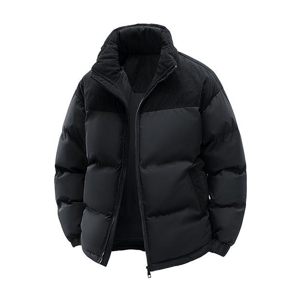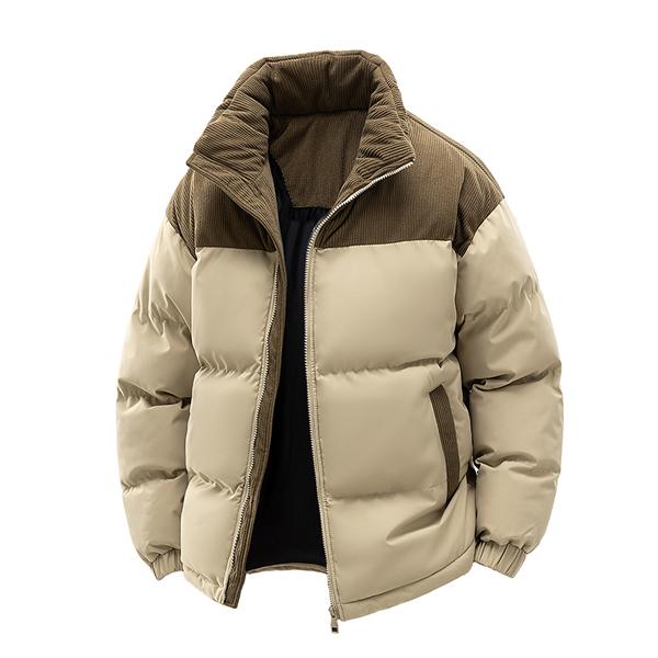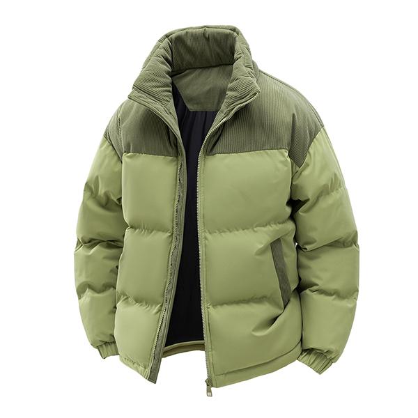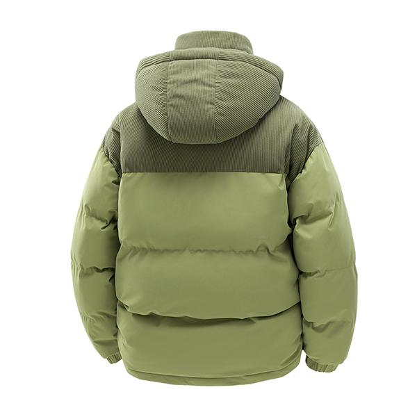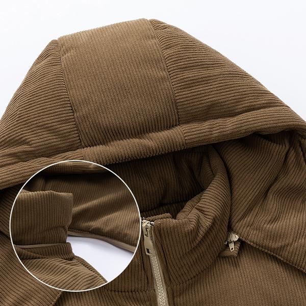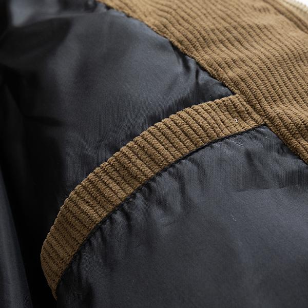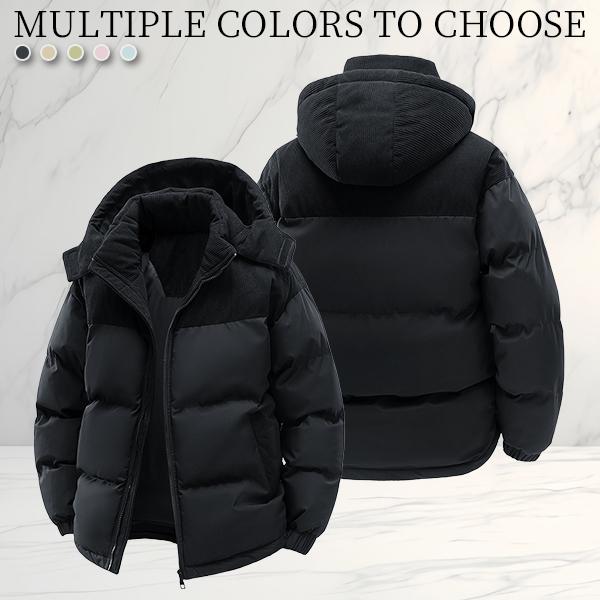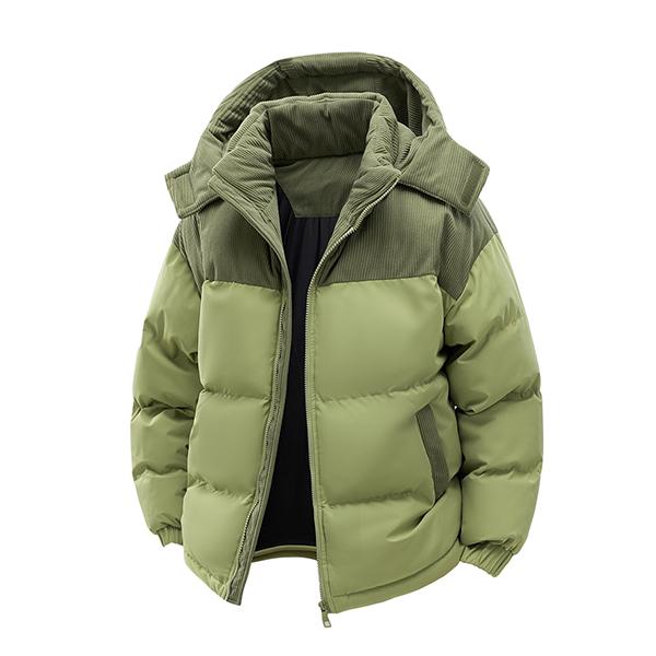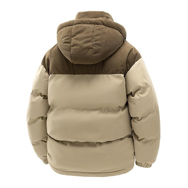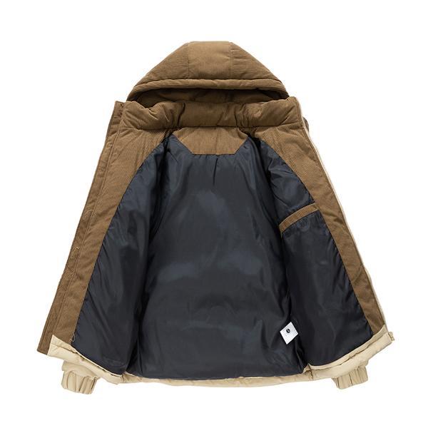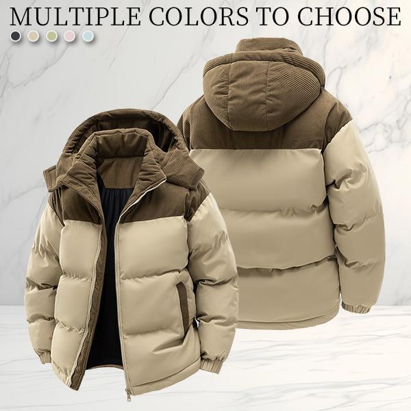 Autumn and winter men's colorblock hooded cotton jacket with detachable collar, vintage corduroy patchwork design, versatile styling options in multiple colors to suit individual preferences, perfect for everyday street style, , or hanging Menswear Coats