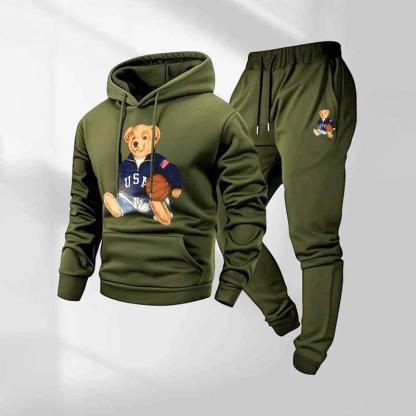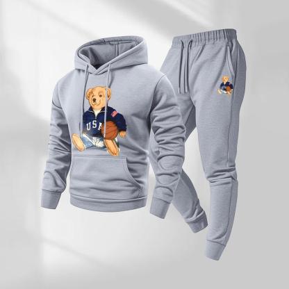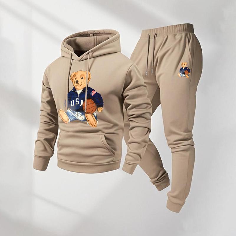 Men's Basketball Cartoon Bear Patterned Hoodie And Drawstring Track Pants Set, Men's Casual Athletic Long-Sleeved Hooded Jacket And Pants, Suitable For Fall And Winter, Street Style Hoodie Set, Indoor And Outdoor Sportswear,