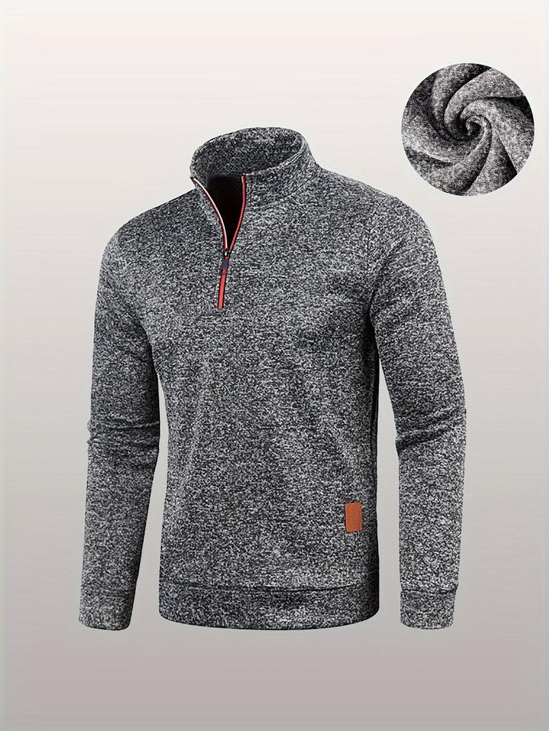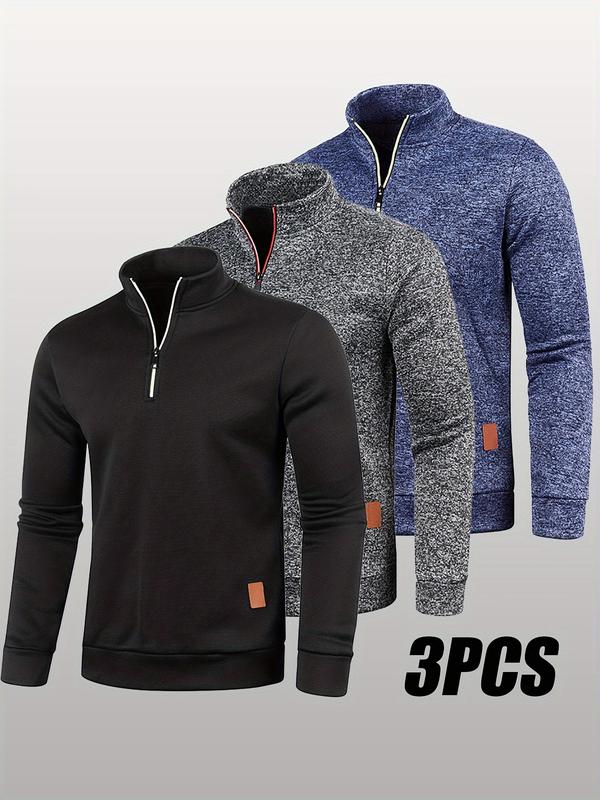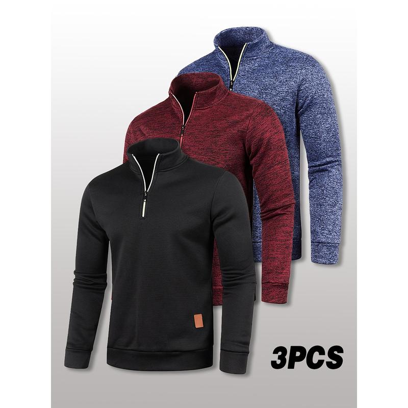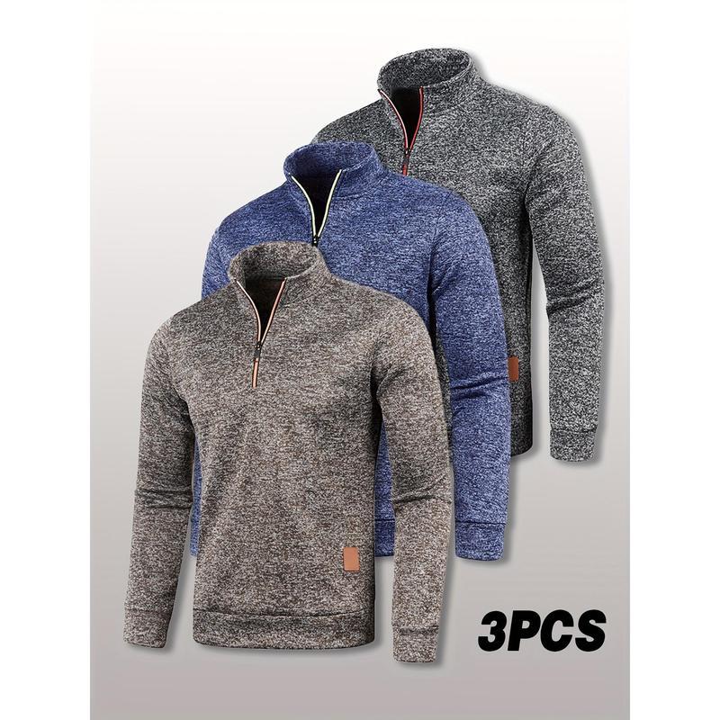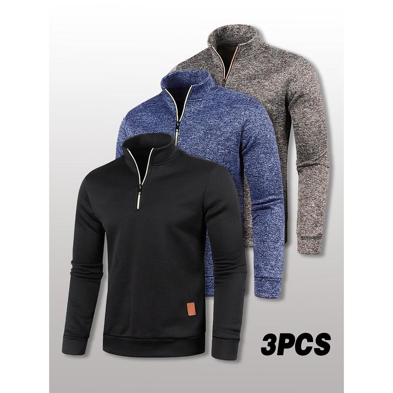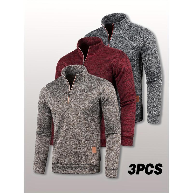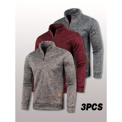 3-Pack Men'S Fleece-Lined Half-Zip Sweatshirts, Casual Solid Color Pullovers with Stand Collar, Long Sleeve, Polyester 100%, Slight Stretch, Knit Fabric, 210g/m², for Fall/Winter, Hiking & Outdoor, Regular Fit