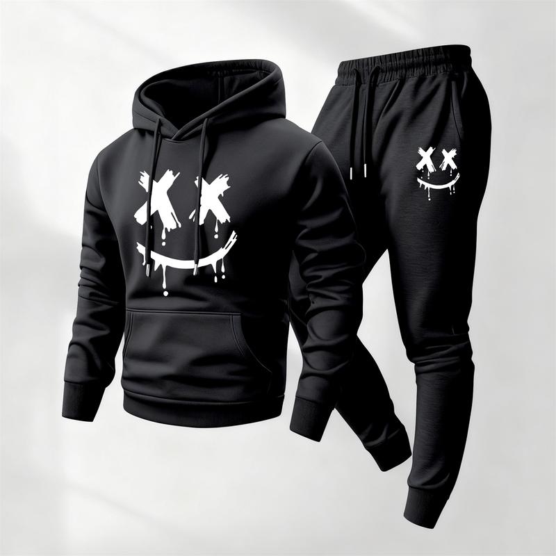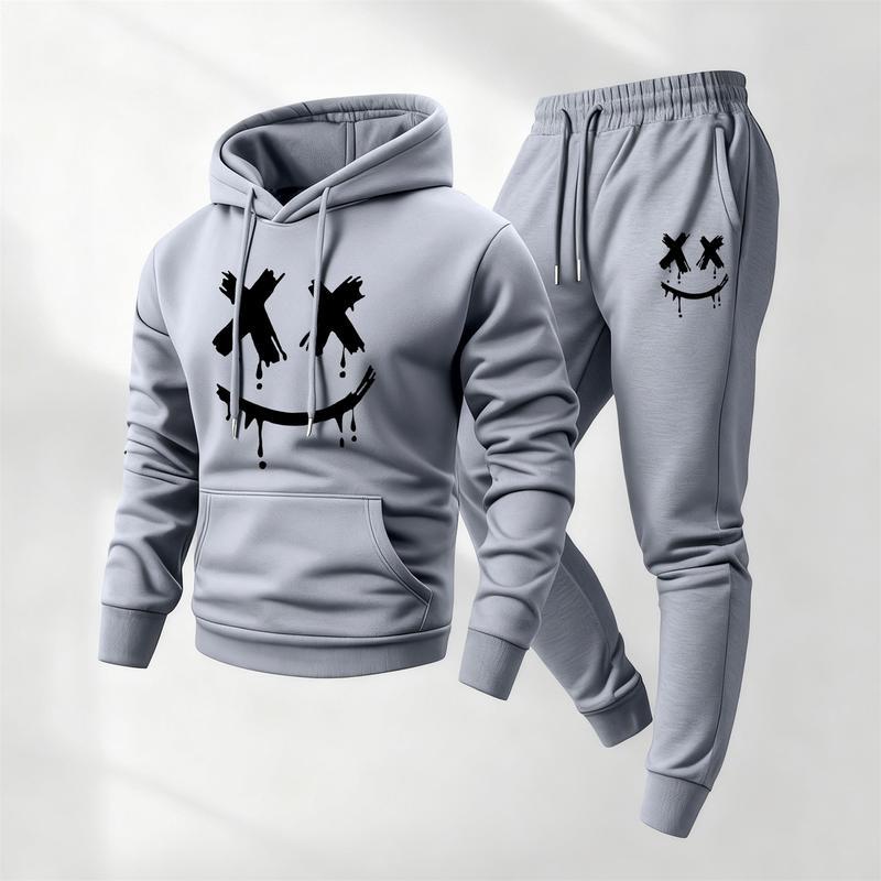 Men's Smiling Face Printed Hoodie and Drawstring Sweatpants Set, Menswear, Casual Athletic Long Sleeve Hooded Jacket & Trousers for Fall & Winter, Men's Clothing for Daily Wear, Sportswear Indoor Outdoor, Tracksuit, Athleisure Summer Clothes