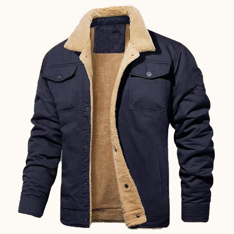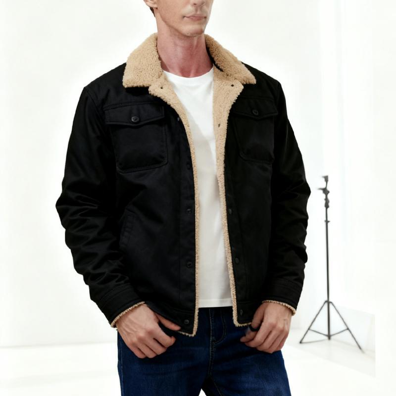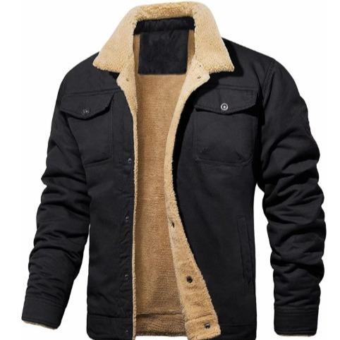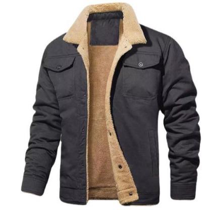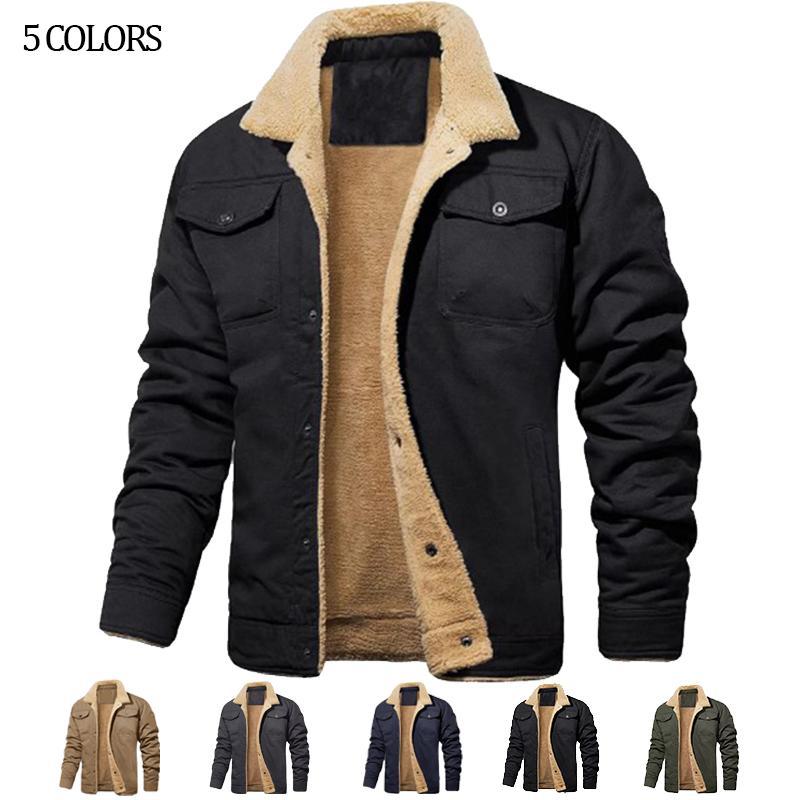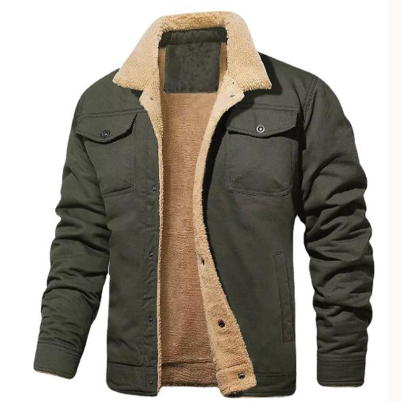 Men's Lined Winter Trucker Jacket Warm Multi-Pocket Casual Coat with Collar Cotton Fleece Long Sleeve Khaki Beige Stylish Menswear Top Suitable for Fall Outdoor Activities Daily Wear