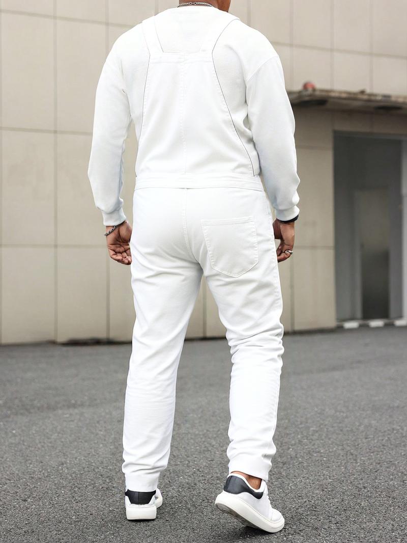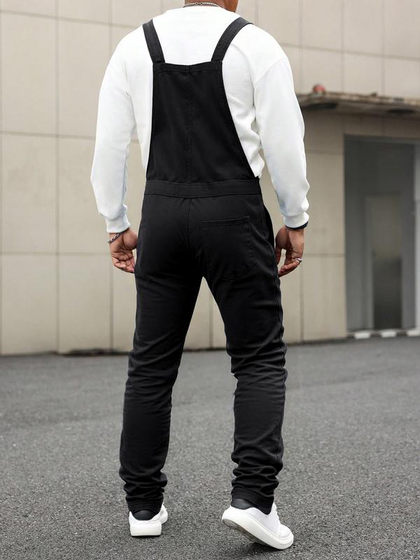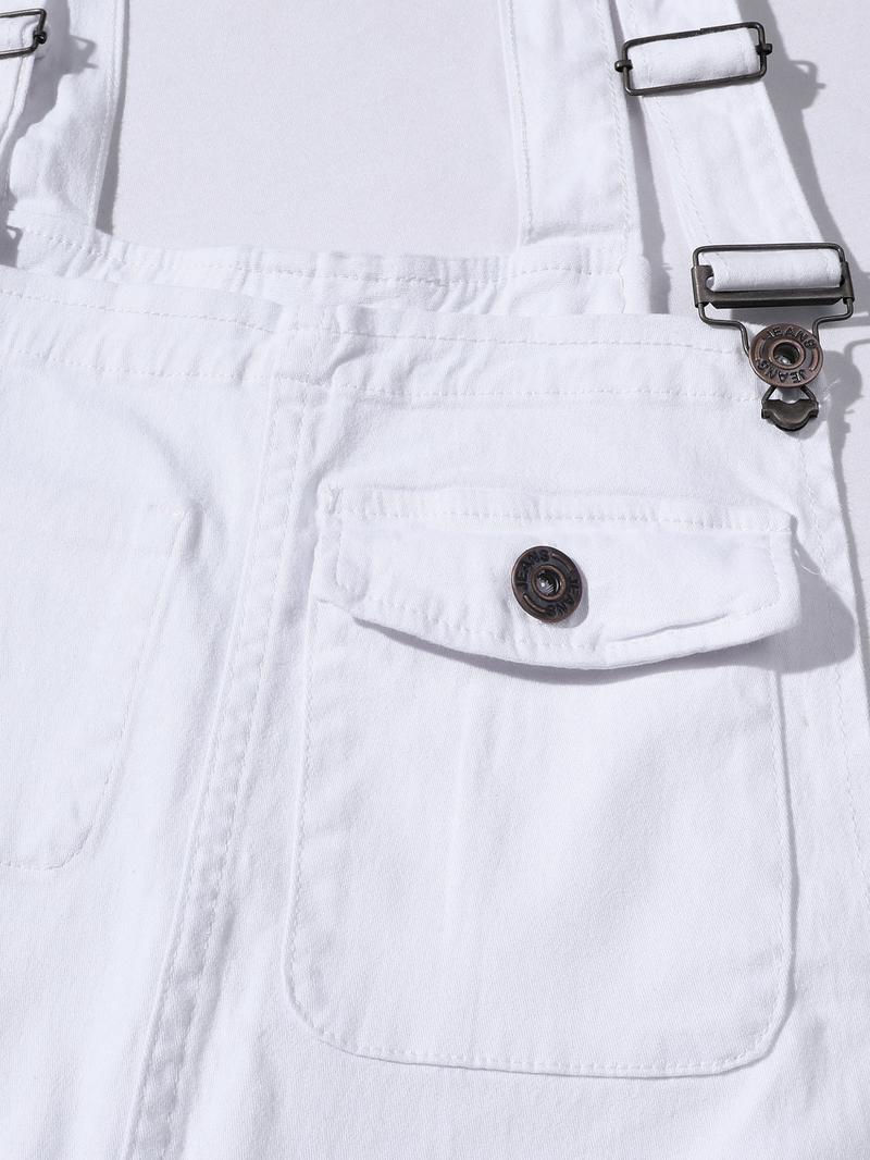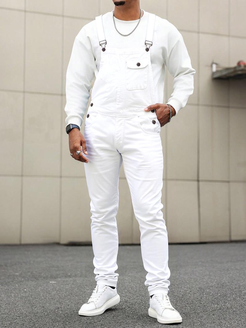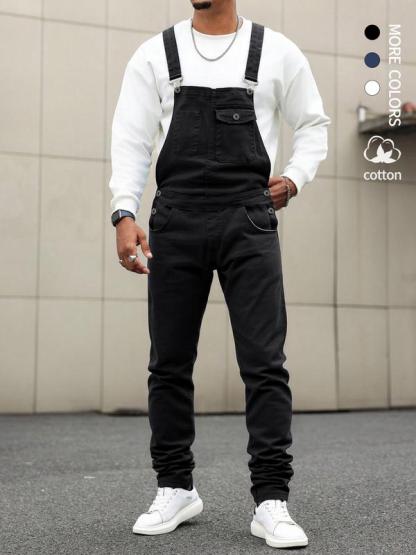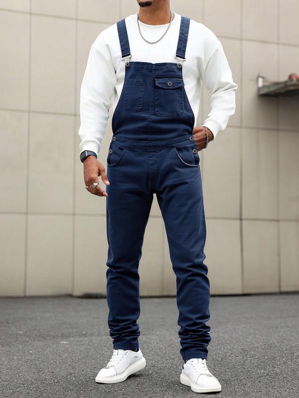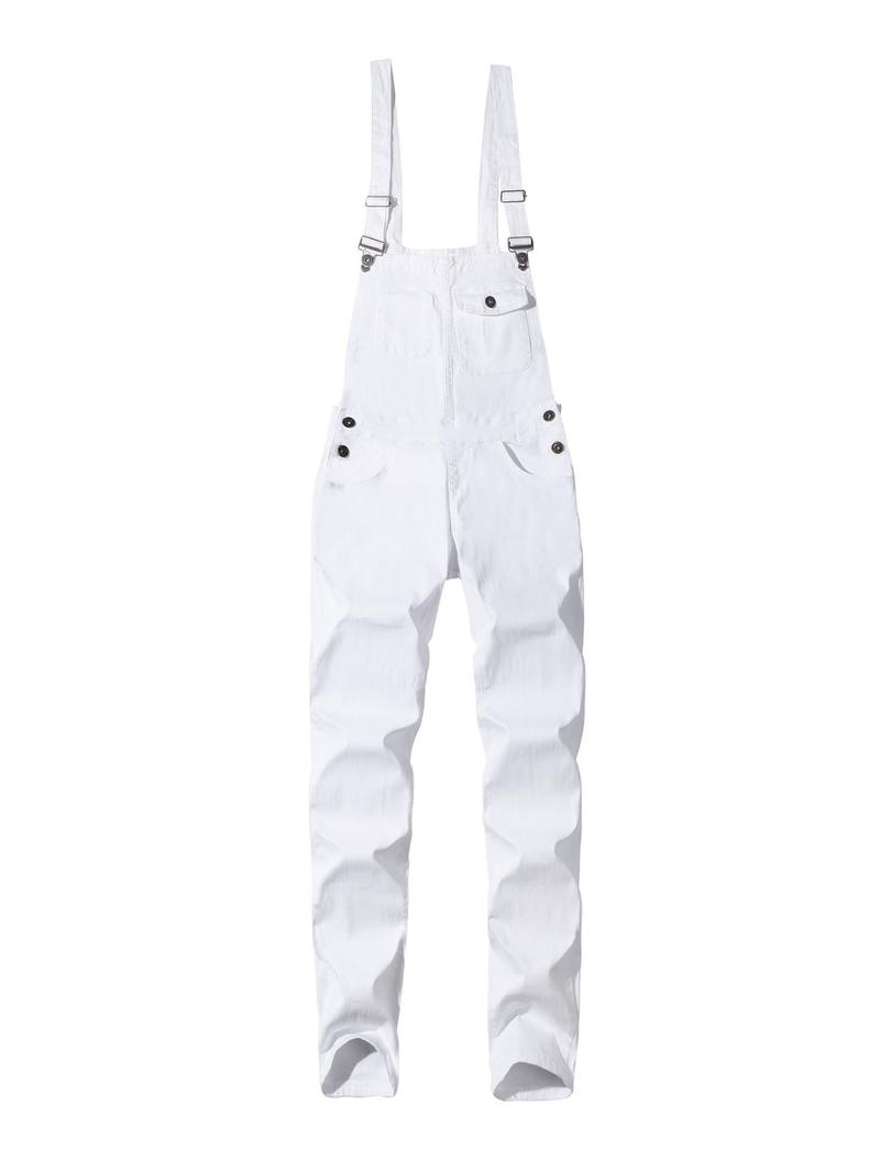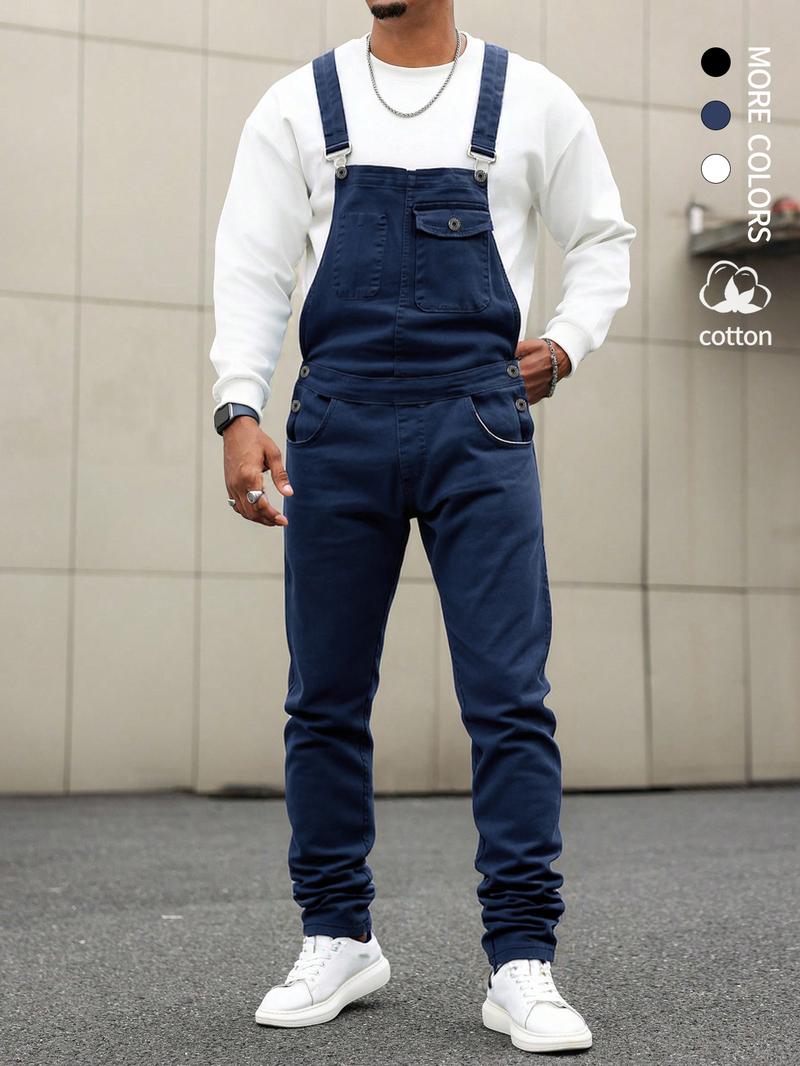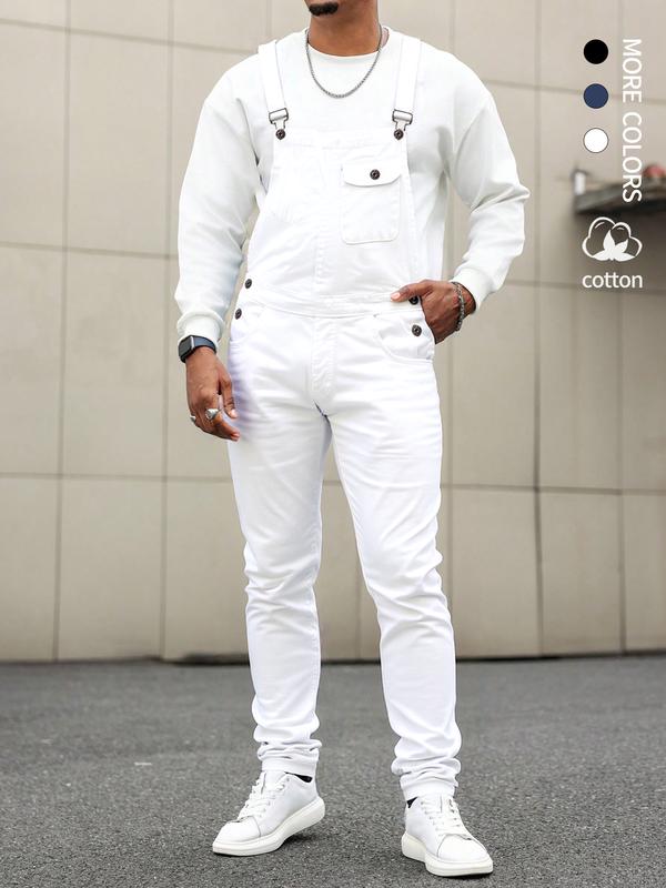 Men's Casual Denim Jumpsuit, Elastic Jean Fabric Adjustable Straps & Pockets, Workwear Overall, All Seasons, Button Fly, Fitted Style